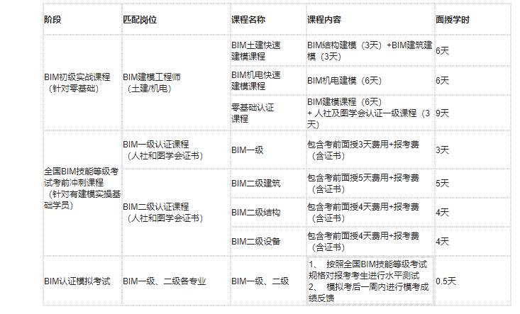 八、全国BIM技能等级考试课程安排: